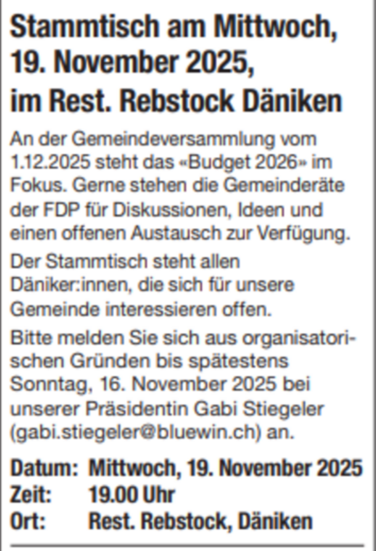 Am Stammtisch vom November steht das "Budget 2026" im Fokus. Kommen Sie vorbei und erfahren Sie schon vor der Gemeindeversammlung vom 1. Dezember 2025 mehr darüber!